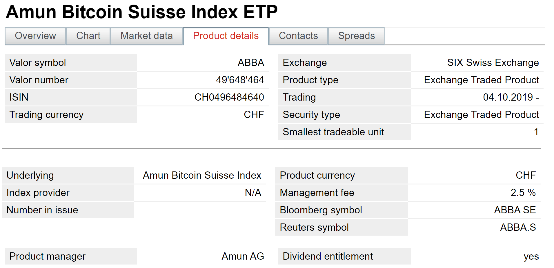 MV Index Solutions (MVIS) and Swiss fintech company Amun AG revealed Thursday the launch of their most recent crypto ETP, in association with Bitcoin Suisse. The Amun Bitcoin Suisse ETP (ticker: ABBA) has actually begun trading on 6 Swiss Exchange, the main stock market in Switzerland for standard financial investments such as stocks, bonds, and exchange-traded funds (ETFs).