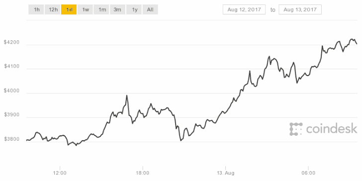 Accordingto the CoinDesk Bitcoin Price Index, the typical cost of bitcoin throughout international exchanges today reached a height of $ 4,225at 9: 07 a.m. UTC, having actually opened at $ 3,917 At press time, the cost had actually dropped somewhat to $4,162