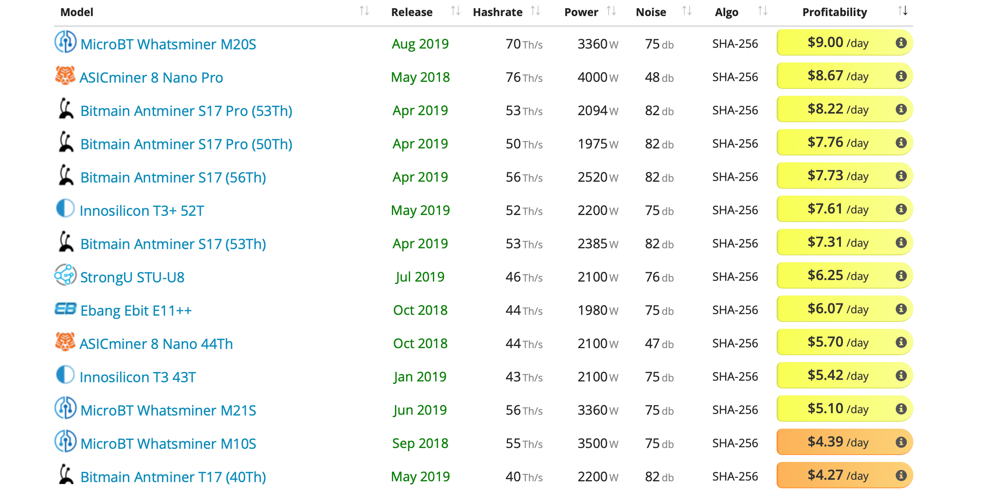 All of Bitmain’s brand-new S17 series miners are readily available to the general public and the current batches start delivering in December. The rates for the brand-new Antminer designs are in between $2,727 to $2,969 per system. The Bitmain mining rigs are geared up with TSMC wafered 7nm chips and depending upon the design each maker takes in 1975W to 2520W off the wall. The just other business that produces a mining rig that carries out above 50TH/s would be the 6th most lucrative miner today: the Innosilicon Terminator 3 (T3). The T3 processes the SHA-256 algorithm at around 53TH/s and can make anywhere in between $5-9 a day with an electrical rate of $0.13 per kWh. Mining rig producers that have a couple of devices that produce terahash simply below the 50TH/s mark consist of the brand-new Strongu STU-U8 (46TH/s) introduced in January and the Ebang Ebit E11 ++ (44TH/s) launched in 2018.