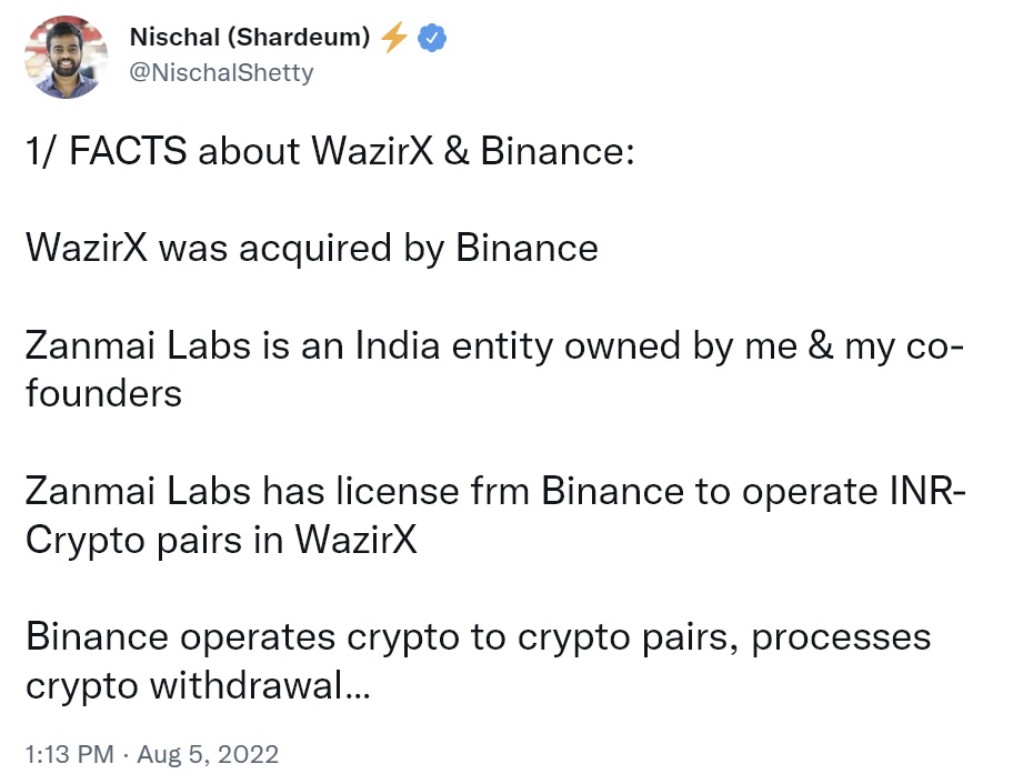 Asking financiers not to puzzle Zanmai Labs and Wazirx, he exposed that Binance owns the Wazirx domain, has root access to its AWS servers, has all the crypto assets, and gets all the crypto revenues.