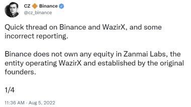 Having seen media reports of his exchange being pointed out in connection with Wazirx, Binance CEO Changpeng Zhao (CZ) stated on Twitter that his business “does not own any equity in Zanmai Labs.”