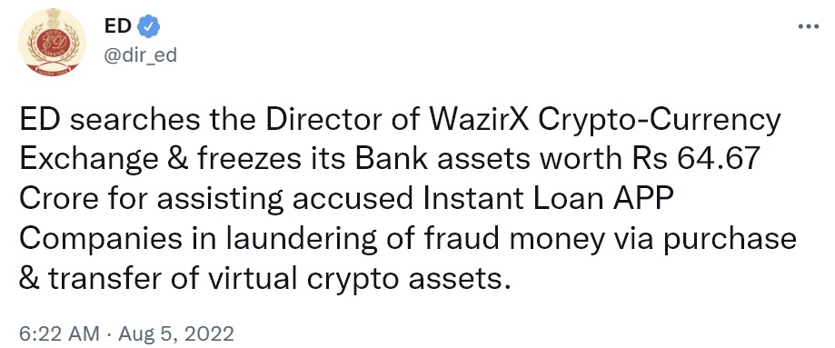 Directorate of Enforcement (ED) has actually carried out searches on one of the directors of M/s Zanmai Lab Pvt Ltd, which owns the popular cryptocurrency exchange Wazirx and has actually provided a freezing order to freeze their bank balances to the tune of INR 64.67 crore.