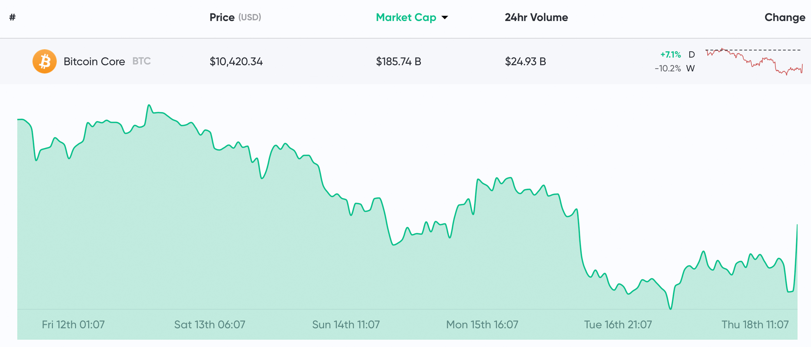On Wednesday, cryptocurrency bulls were apparently tired and bears had actually briefly taken the reins, clawing back rates over the recently. Currently, the general market capitalization of the whole cryptoconomy is $281 billion with around $83 billion worth of 24-hour worldwide trade volume. The leading digital property by market assessment, bitcoin core (BTC), is down over 8% over the last 7 days. One BTC is trading for $10,622 after touching a low of $9,165 on Wednesday. BTC is followed by the 2nd biggest market cap held by ethereum (ETH) which has actually dipped by 17% this previous week.