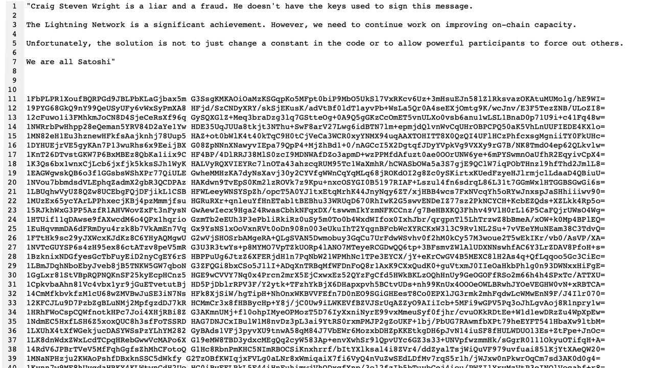 Craig Steven Wright is a phony and a scams. He doesn’t have actually the secrets utilized to sign this message. The Lightning Network is a substantial accomplishment. However, we require to continue deal with enhancing on-chain capability. Unfortunately, the service is not to simply alter a continuous in the code or to permit effective individuals to dislodge others. We are all Satoshi.