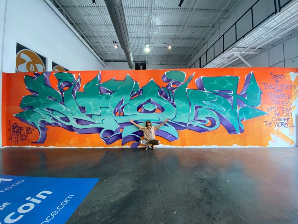 Mear One: In 2009, during a conversation at a local coffee shop, I met a mathematician who introduced me to Bitcoin for the first time. Historically, I had not envisaged myself as one who would invest in currency, thus it remained an intriguing concept at the back of my mind. As I delved deeper into the essence of money through the Occupy movement and my London mural experience in 2012, I found my path leading to my inaugural Bitcoin conference at Anarchapulco, Mexico. There, I encountered a community of anarchists who echoed my political and lifestyle sentiments. Inquisitive and eager, I absorbed their insights. I completed two live art pieces for the community, which were auctioned, and those collectors assisted me in establishing my first wallet (a note of gratitude to EDGE) along with facilitating transactions in exchange for my proof-of-work. It was in that moment that the connection solidified, as I attained my first coins.