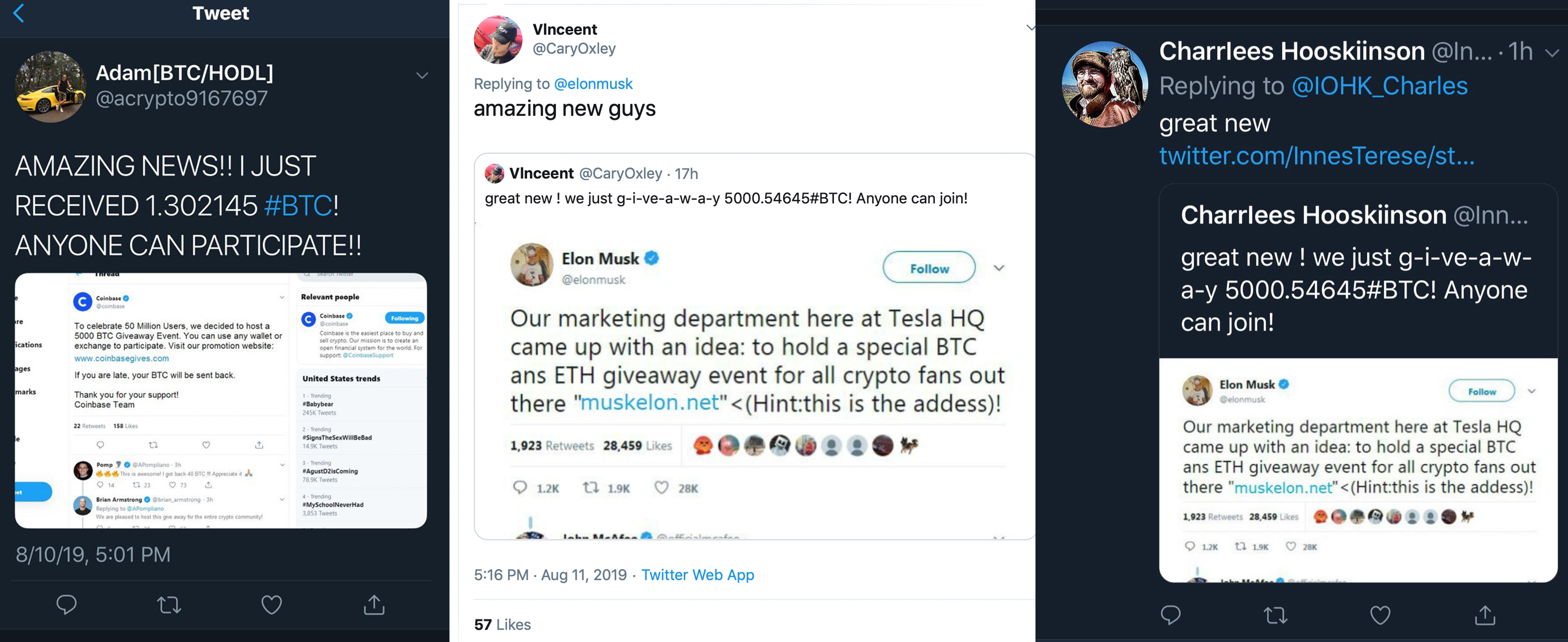 Below the tweet, another fraud Twitter account includes to the con video game by stating they got some coins from the free gift. “OMG — Just got 2 BTC, thanks for sharing this,” the user “Sierra” exclaims while 59 individuals have actually liked her tweet. Another phony account called “Charrlees Hooskiinson” can be seen tweeting the very same fraud in a genuine Twitter thread begun by Cardano’s Charles Hoskinson. The image shared, in this case, is an image of a phony Elon Musk account which states: “Our marketing department here at Tesla HQ created a concept — to hold an unique BTC and ETH giveaway occasion for all the crypto fans out there.” Just like the fake Coinbase account image, the phony Musk account reveals a site to go to where individuals can presumably double their coins.